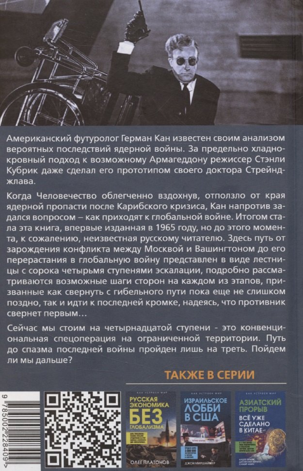 Автор этой книги, американский футуролог и исследователь военной стратегии Герман Кан известен своим анализом вероятных последствий ядерной войны и рекомендациями о способах повышения выживаемости. За предельно хладнокровный подход к возможному Армагеддону режиссер Стэнли Кубрик даже сделал его прототипом своего доктора Стрейнджлава. Теории Кана внесли большой вклад в развитие ядерной стратегии США. Когда Человечество облегченно вздохнув, отползло от края ядерной пропасти после Карибского кризиса, Кан напротив задался вопросом – как приходят к глобальной войне. Итогом стала эта книга, впервые изданная в 1965 году, но до этого момента, к сожалению, неизвестная русскому читателю. Здесь путь от зарождения конфликта между Москвой и Вашингтоном до его перерастания в спазматическую или бездумную войну представлен в виде лестницы с сорока четырьмя ступенями эскалации, подробно рассматриваются возможные шаги сторон на каждом из этапов, призванные как свернуть с гибельного пути пока еще не слишком поздно, так и подойти к последней кромке, надеясь, что противник свернет раньше… Сейчас мы стоим на четырнадцатой ступени Лестницы Кана - это конвенциональная спецоперация на ограниченной территории. Путь до спазма последней войны пройден лишь на треть. Пойдем ли мы дальше?