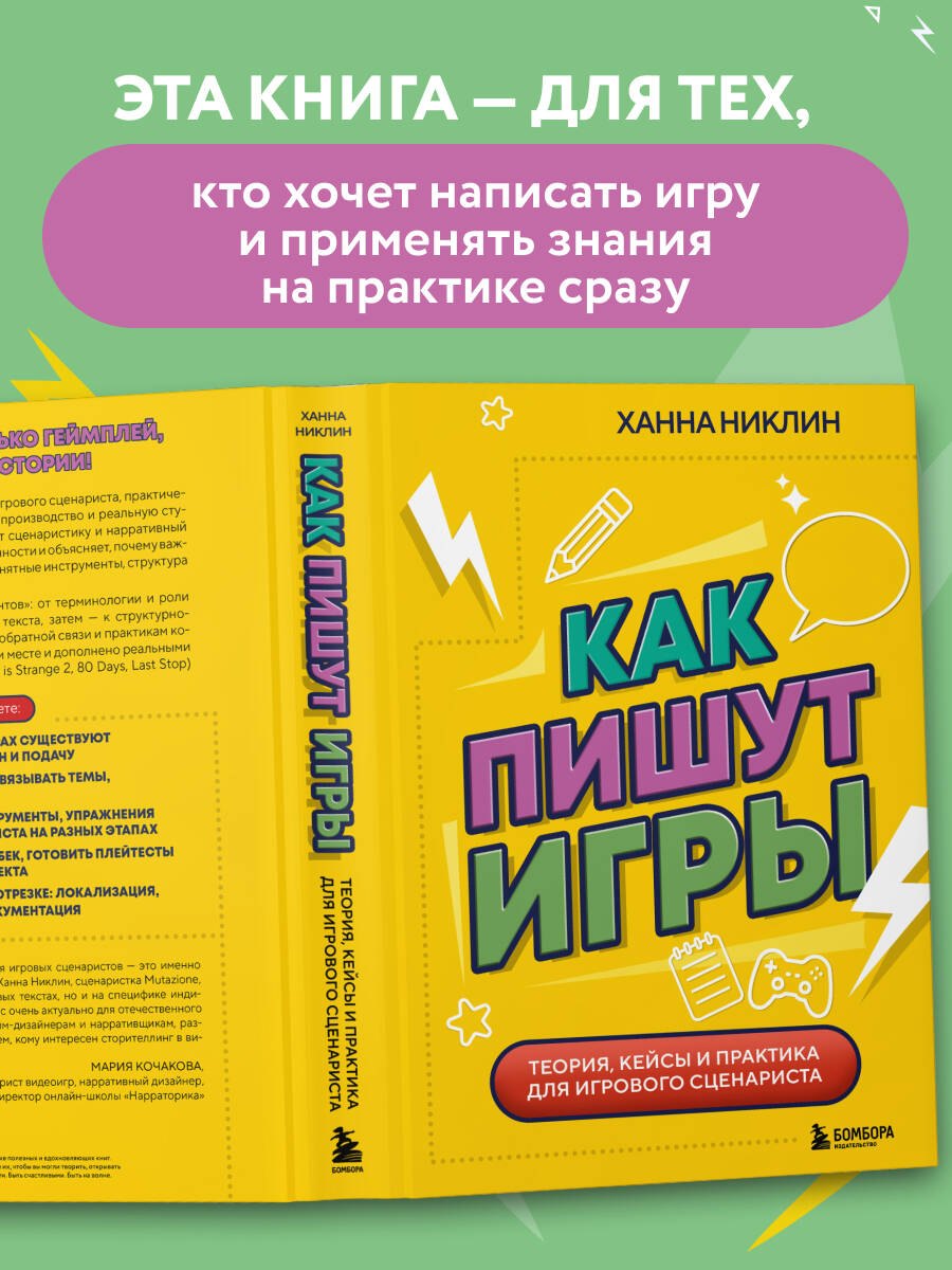 «Книга по писательскому мастерству для игровых сценаристов — это именно то, чего нам не хватает. К тому же автор, Ханна Никлин, сценаристка Mutazione, фокусируется не только на внутриигровых текстах, но и на специфике инди-игр с небольшими бюджетами, что сейчас очень актуально для отечественного рынка. Учебник подойдет студентам — гейм-дизайнерам и нарративщикам, разработчикам собственных проектов и всем, кому интересен сторителлинг в видеоиграх». — Мария Кочакова, сценарист видеоигр, нарративный дизайнер, инди-разработчик, директор онлайн-школы «Нарраторика»