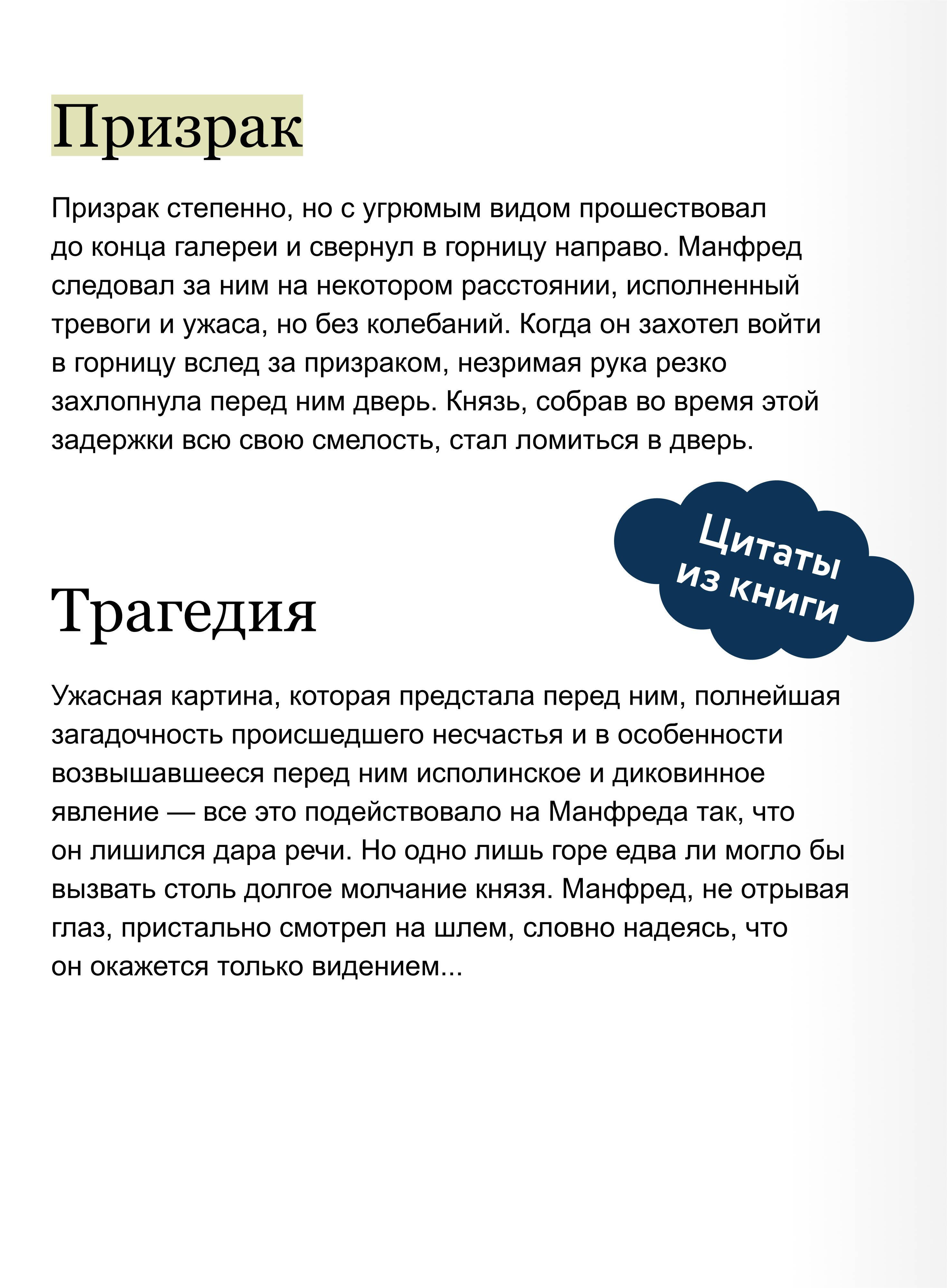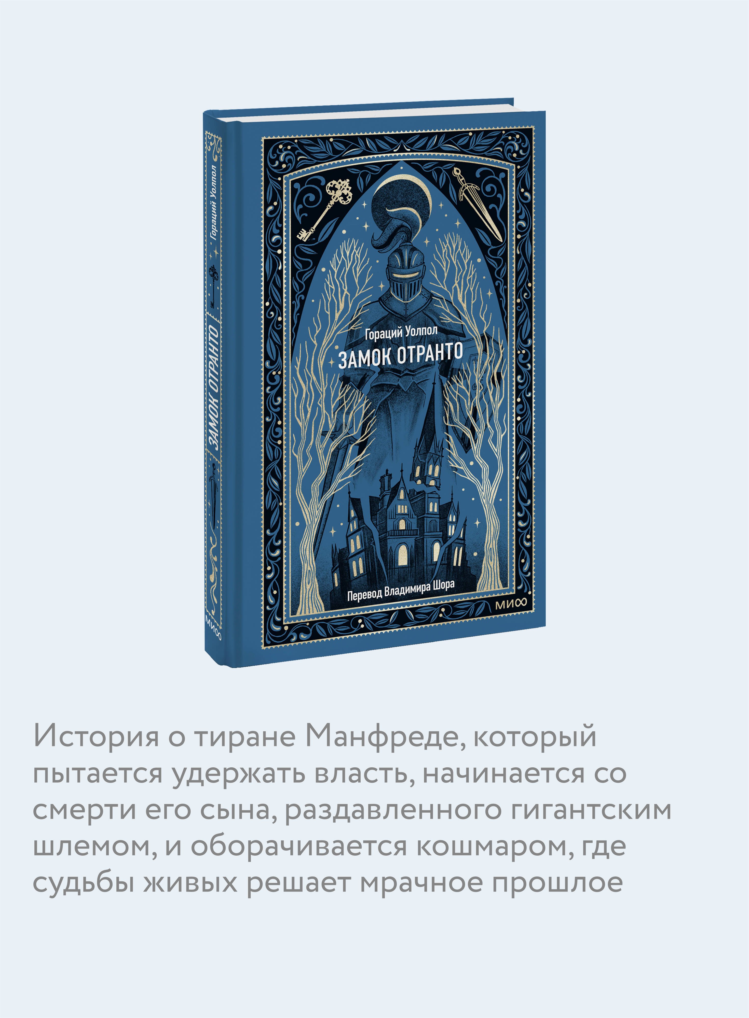 "Замок Отранто" — произведение, положившее начало жанру готического романа. Средневековый замок, зловещее пророчество, мстительные призраки и роковые тайны — Уолпол виртуозно смешивает реальное и сверхъестественное. Даже первое издание было мистификацией: Уолпол выдал роман за перевод древнего итальянского текста, найденного в Отранто. Но уже в предисловии ко второму изданию признал свое авторство.