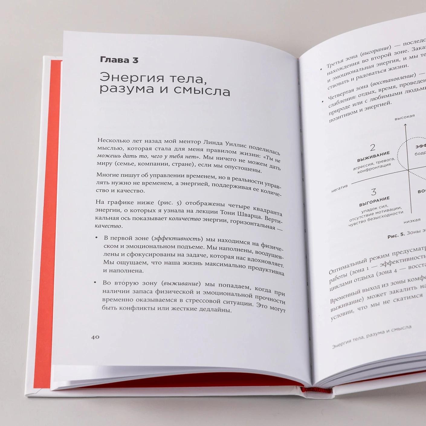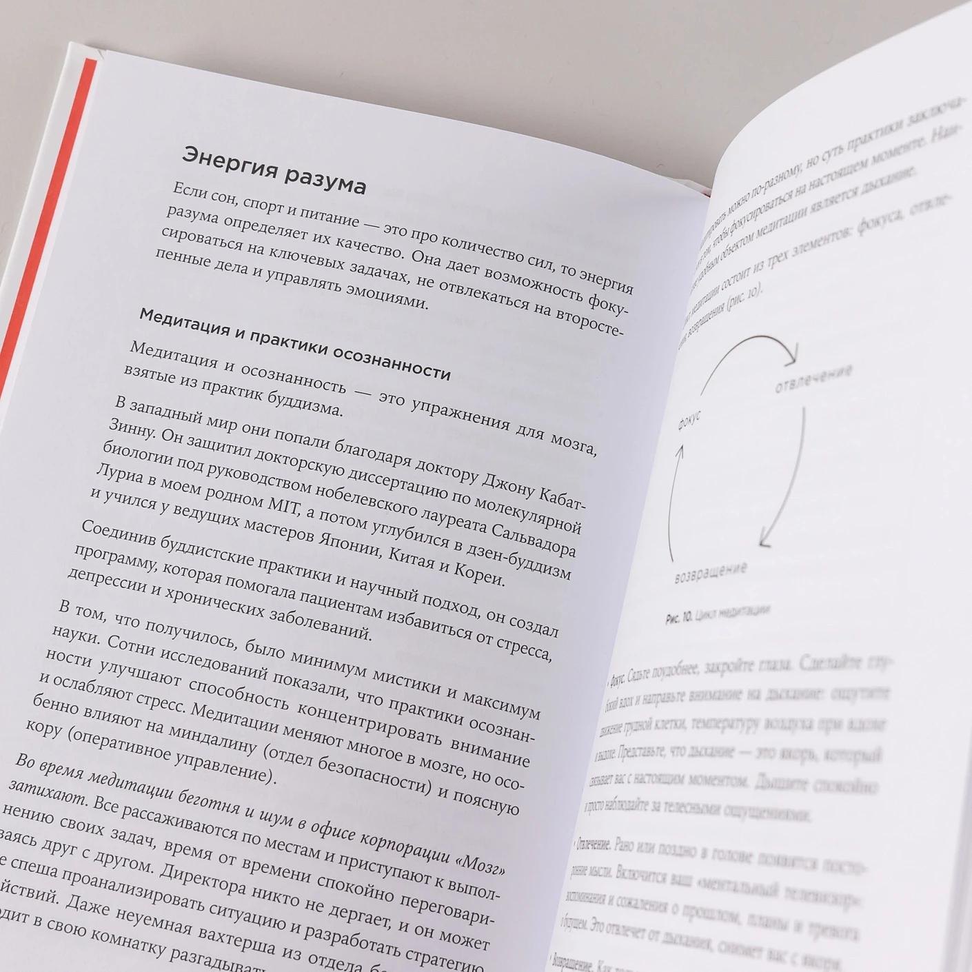Начинает автор с небольшого ликбеза о работе и структуре мозга, объясняющего, чем обусловлено наше, кажущееся порой нелогичным, поведение. Далее рассказывает о стрессе, приводящим к выгоранию и о том, как с ним справиться на каждой из стадий. Спойлер: для этого нужно поддерживать энергию в достаточном количестве и качестве. Автор делит энергию на три вида: энергия тела (сон, питание, физическая активность), энергия разума (медитации, digital-детокс, управление эмоциями), энергия смысла (применение наших сильных сторон на благо людям).
