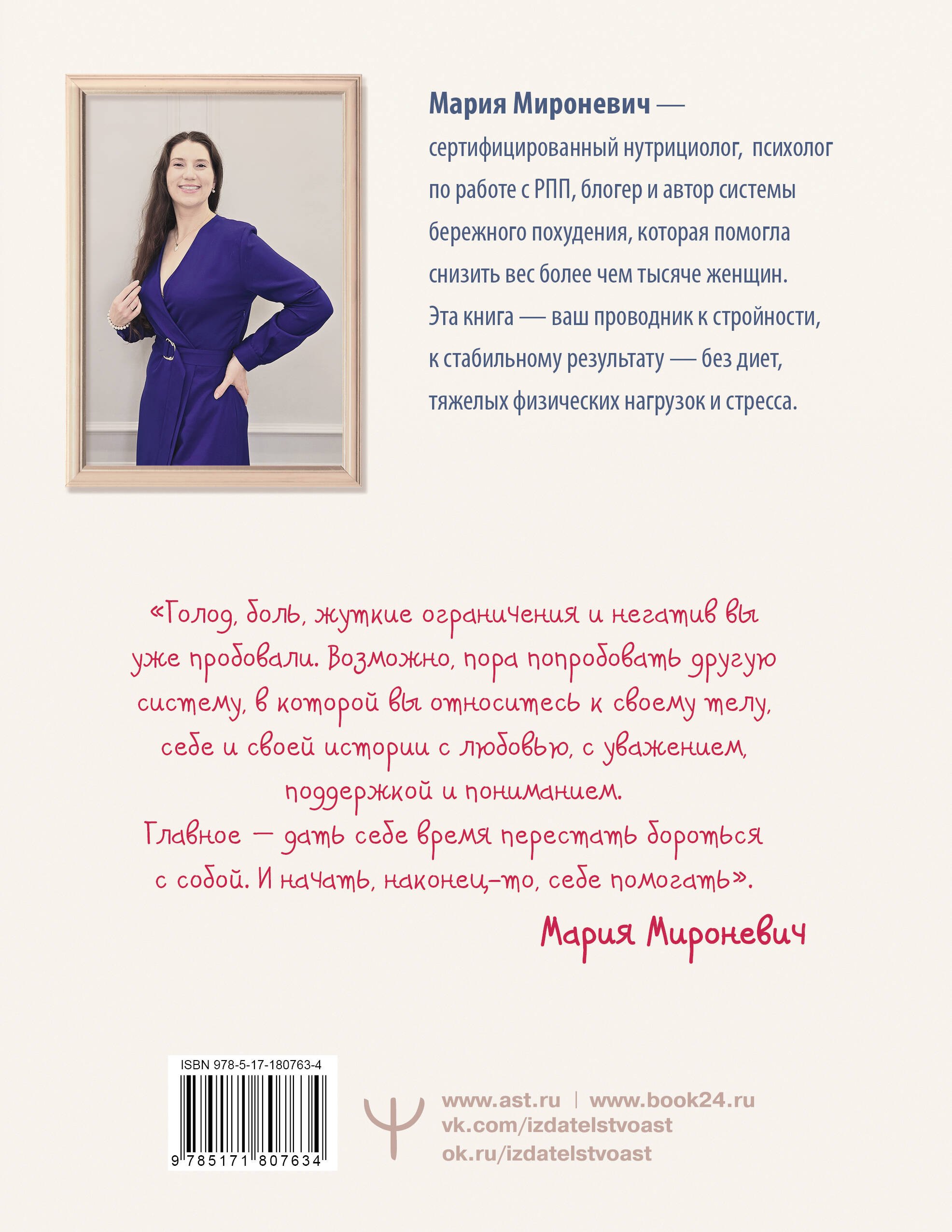 Выполняя рекомендации автора, вы придете к стабильному результату без голодания, тяжелых физических нагрузок и срывов. Вы узнаете, как избавиться от лишних килограммов без изнурительных тренировок, диет и насилия над собой. Вы не только начнете питаться вкусно и разнообразно, с пользой для вашей формы и здоровья, но и сможете обрести мотивацию для того, чтобы начать новую жизнь в новом теле без сомнений и стресса. Книга также подойдет тем, кто уже добился успехов в похудении и хочет закрепить полученный результат.