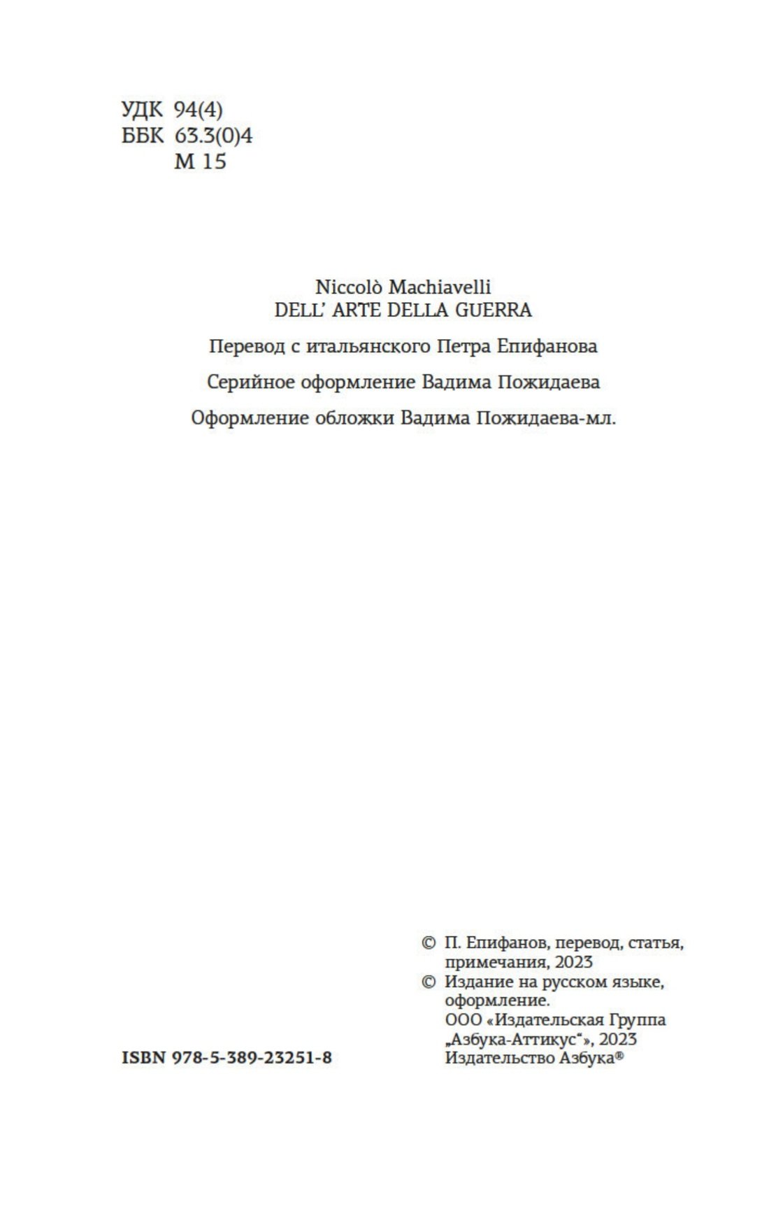 Никколо Макиавелли — один из самых известных итальянских мыслителей и политических деятелей эпохи Возрождения (занимал во Флоренции пост государственного секретаря), писатель, историк, военный теоретик, создавший ряд историко-политических сочинений («Рассуждения о первой декаде Тита Ливия», «История Флоренции»). Самым значительным и неоднозначным его произведением стал трактат «Государь». Долгие годы эта книга ассоциировалась с политикой яда и кинжала, а после ее выхода появился термин «макиавеллизм», обозначающий цинизм, вседозволенность, двуличие в политике. Настоящее издание знакомит читателя с трактатом Макиавелли «О военном искусстве», стоящим в одном ряду с величайшими работами по теории военного дела. Именно здесь впервые звучат идеи, важность которых для последующей истории западного мира трудно переоценить и которые подкреплены множеством примеров великих побед и поражений древности. Трактат «О военном искусстве» представлен в новом переводе и сопровождается статьей и подробными примечаниями.