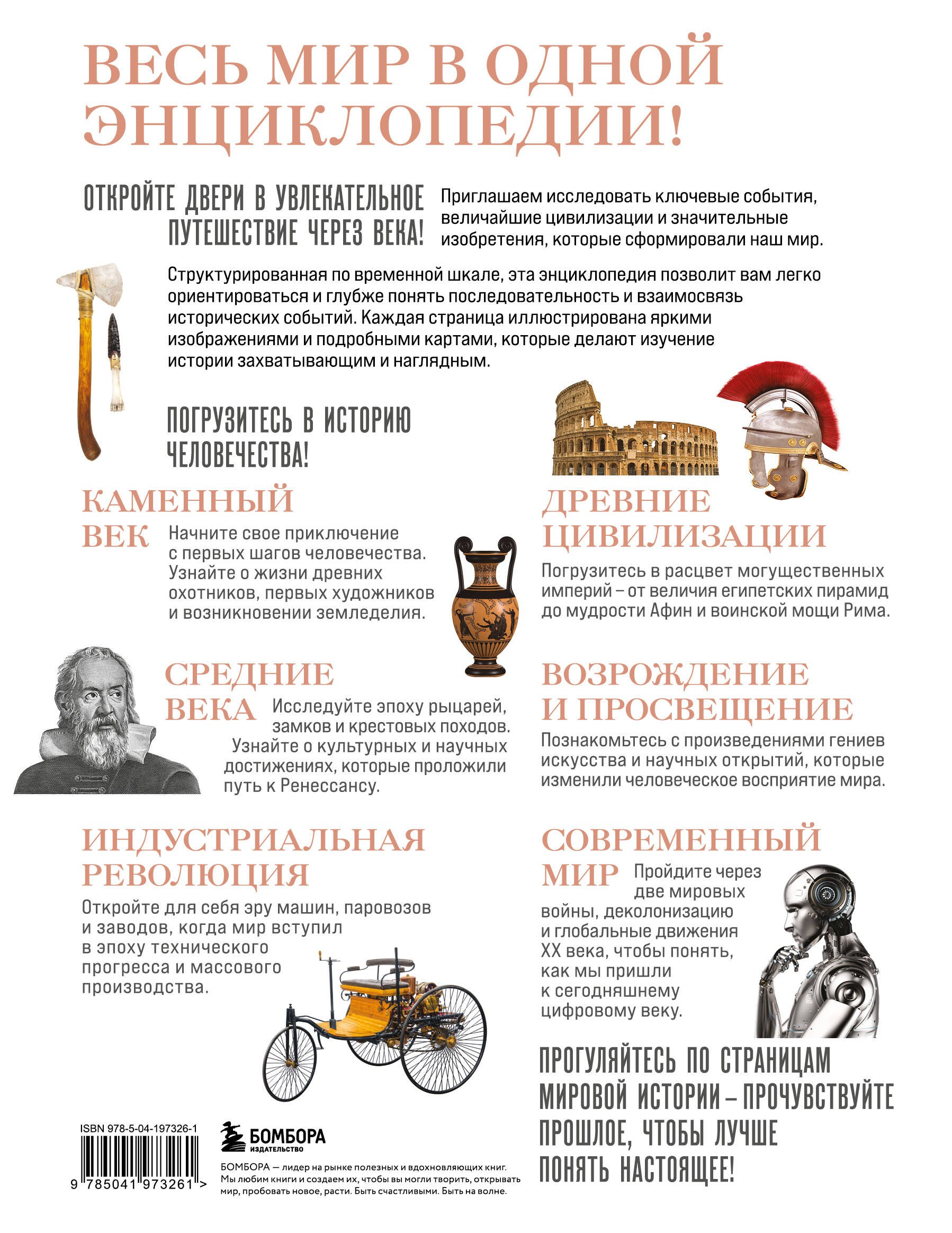 От первых шагов человечества в Каменном веке и величественных империй Древнего мира до замков и рыцарей Средневековья, от гениальных открытий эпохи Возрождения и технических чудес Индустриальной революции до глобальных событий современности — эта энциклопедия станет вашим путеводителем по прошлому, помогая глубже понять настоящее.