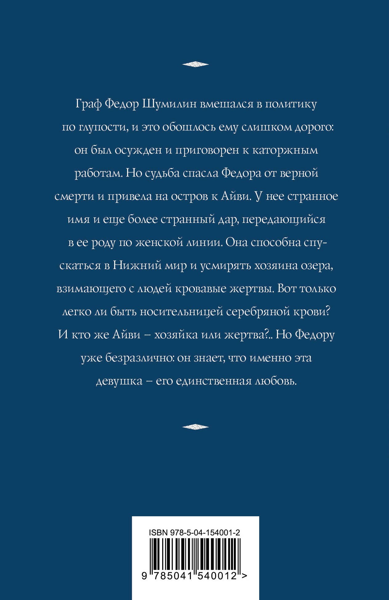 Граф Федор Шумилин вмешался в политику по глупости, и это обошлось ему слишком дорого: он был осужден и приговорен к каторжным работам. Но судьба спасла Федора от верной смерти и привела на остров к Айви. У нее странное имя и еще более странный дар, передающийся в ее роду по женской линии. Она способна спускаться в Нижний мир и усмирять хозяина озера, взимающего с людей кровавые жертвы. Вот только легко ли быть носительницей серебряной крови? И кто же Айви — хозяйка или жертва?.. Но Федору уже безразлично: он знает, что именно эта девушка — его единственная любовь.