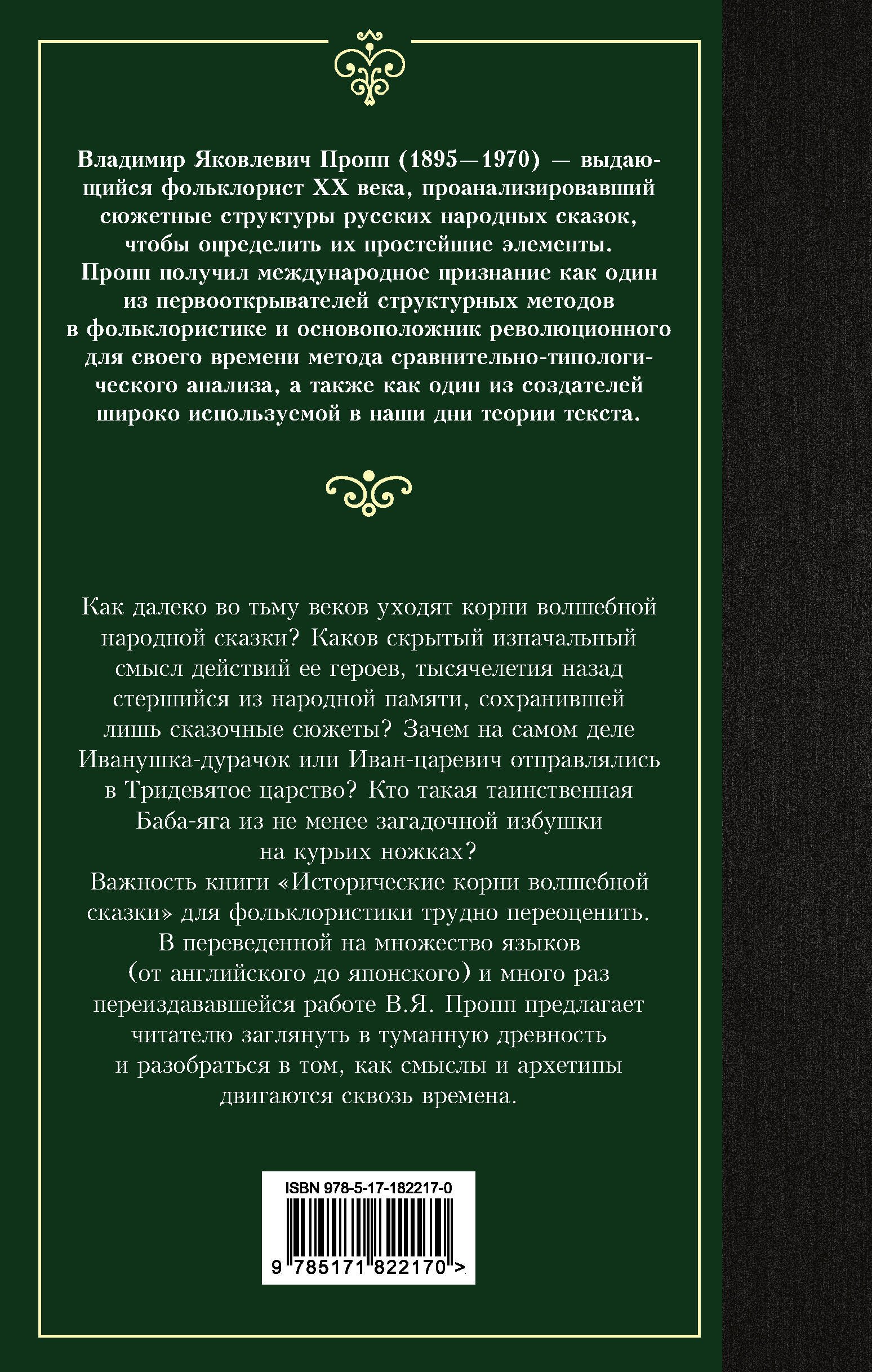 Важность книги "Исторические корни волшебной сказки" для фольклористики трудно переоценить. В переведенной на множество языков (от английского до японского) и много раз переиздававшейся работе В.Я. Пропп предлагает читателю заглянуть в туманную древность и разобраться в том, как смыслы и архетипы двигаются сквозь времена.